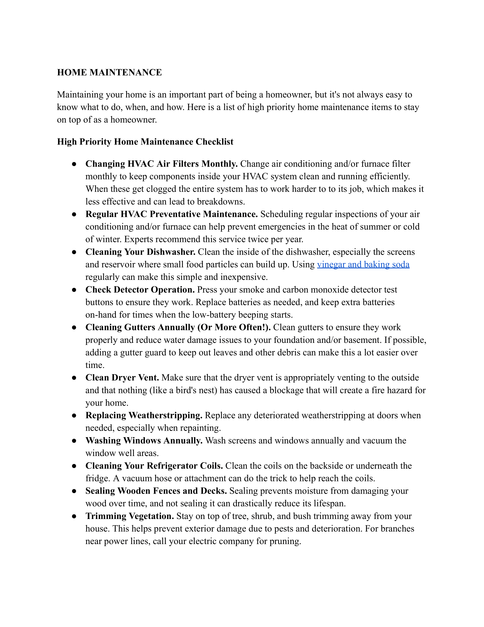 VSCLT also has a helpful list of home maintenance and repair items to be aware of. You can download this list here.